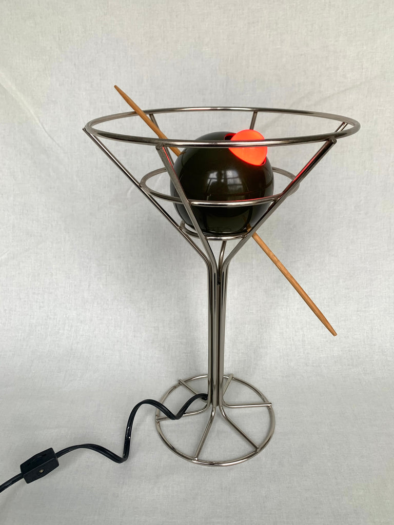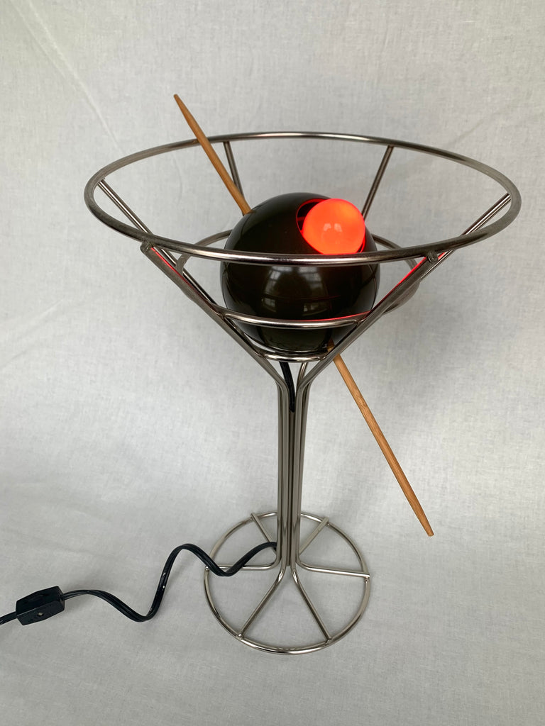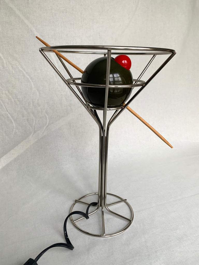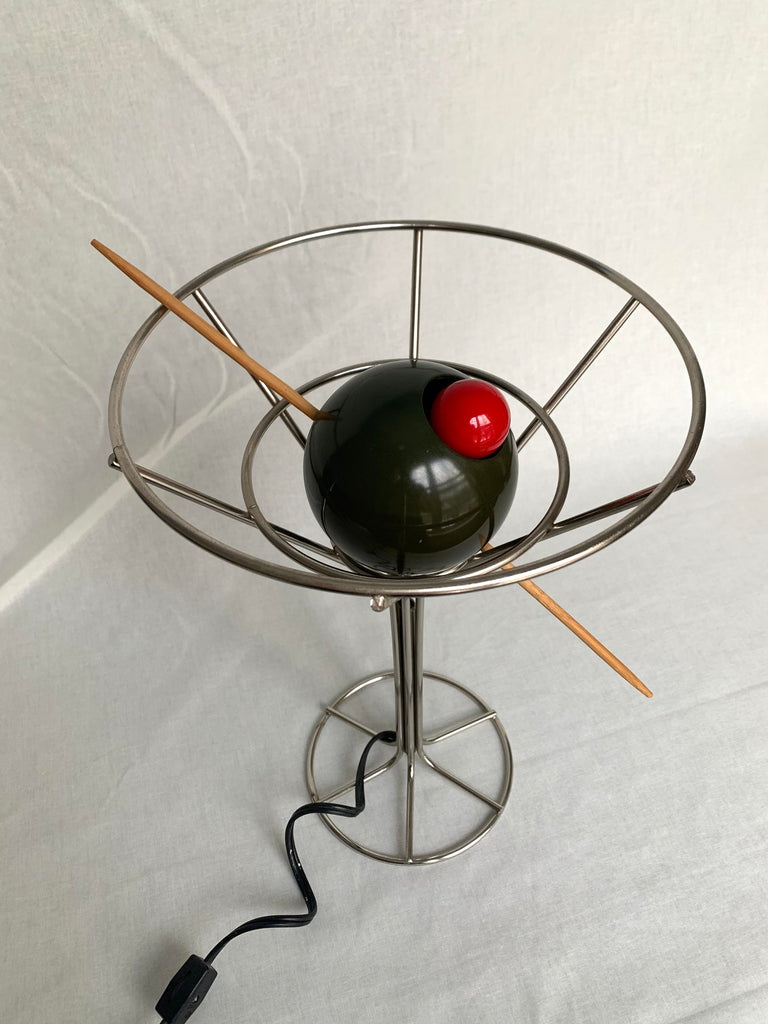 Original David Krys Dirty Martini Lamp! Super fun and the pimento olive with the red light bulb is a cherry on top.  Fun fact: this lamp won an award when it debuted. Measures 14.5 in in height! Chrome base with plastic olive + wooden stick.