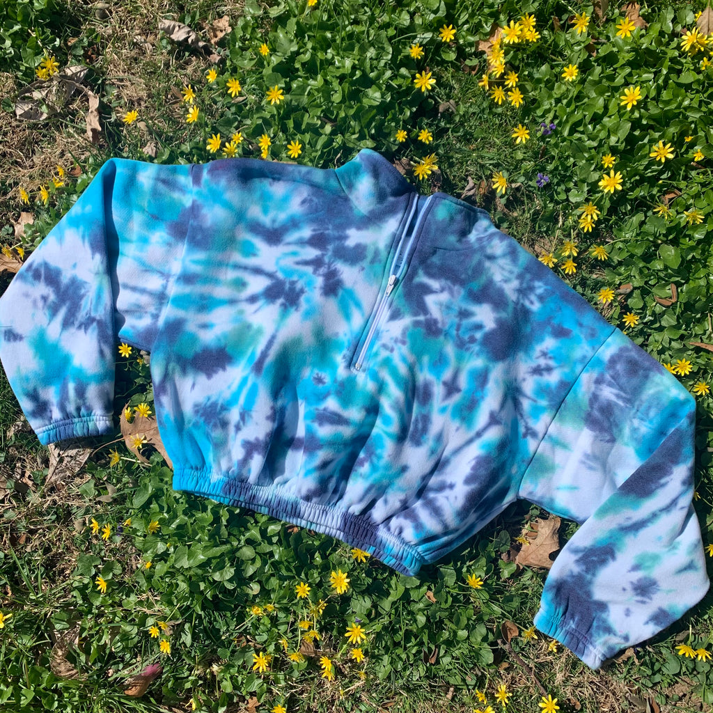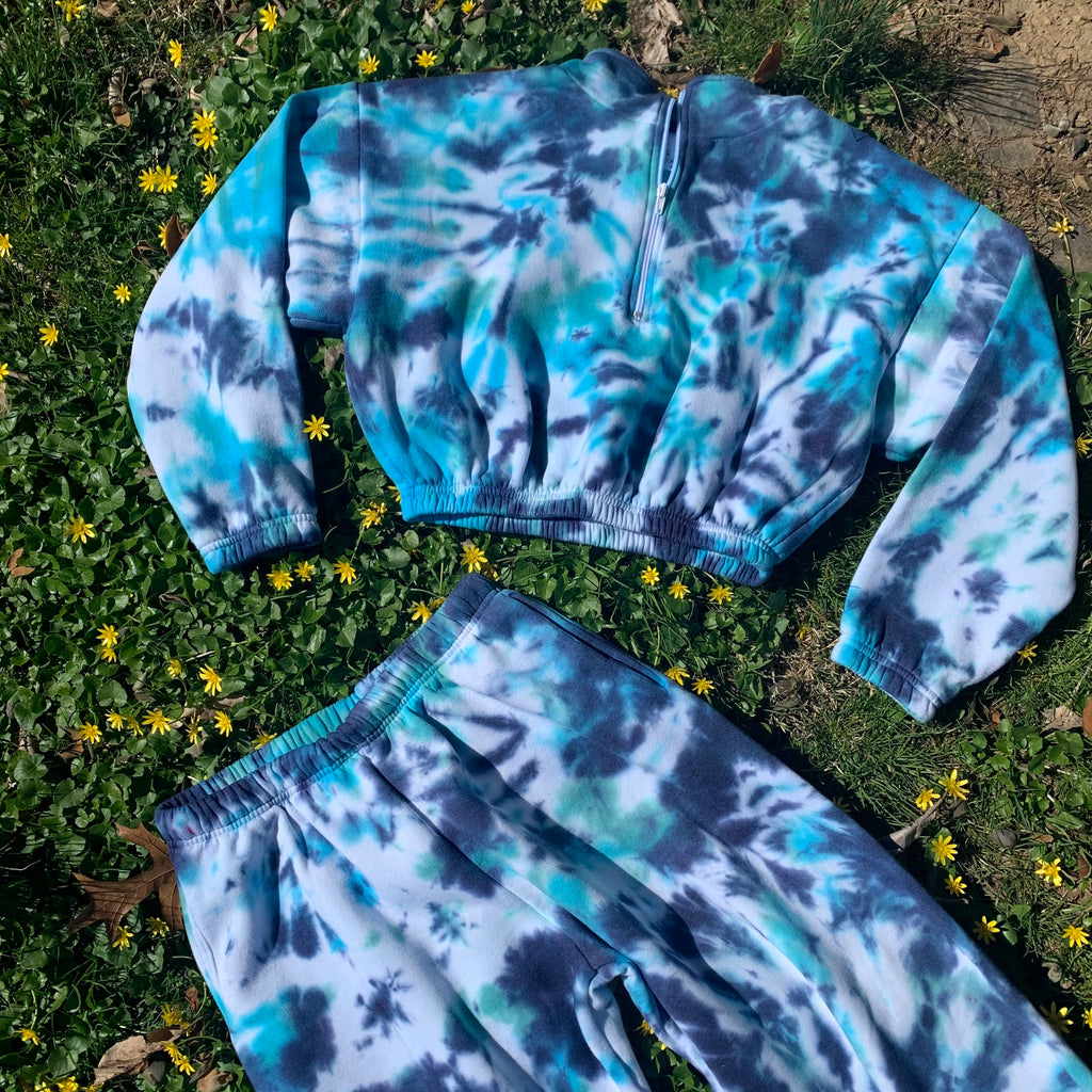MEET THE NEPTUNE SET!! A new colorway and style added to the for good luck fam 💙💙💙 shades of navy, turquoise, and seafoam swirled over a cotton and poly blend cropped half zip and high waisted baggy sweats. This new fabric is super soft and lightweight ✨✨✨