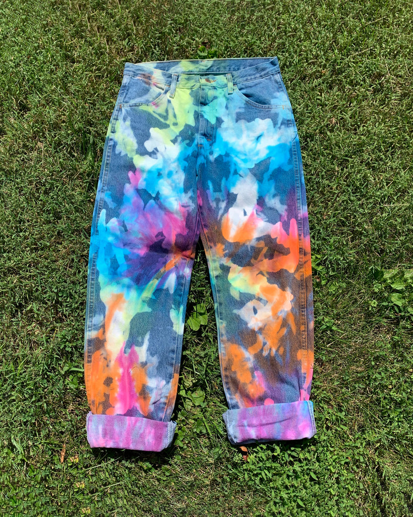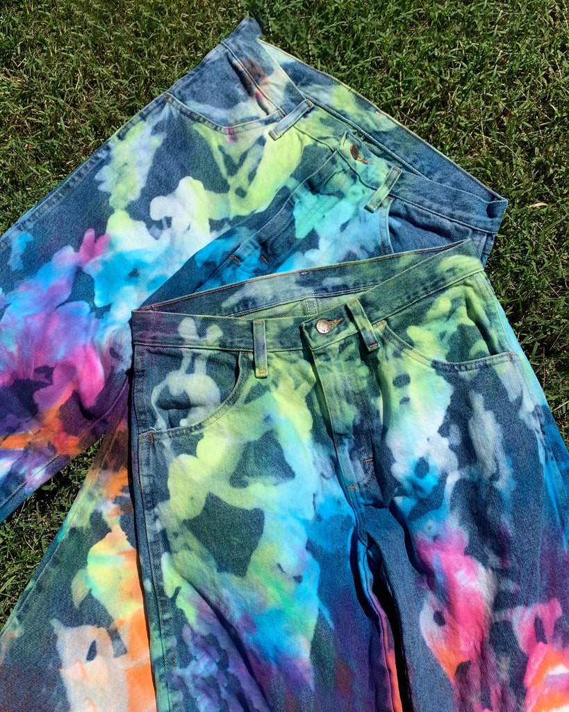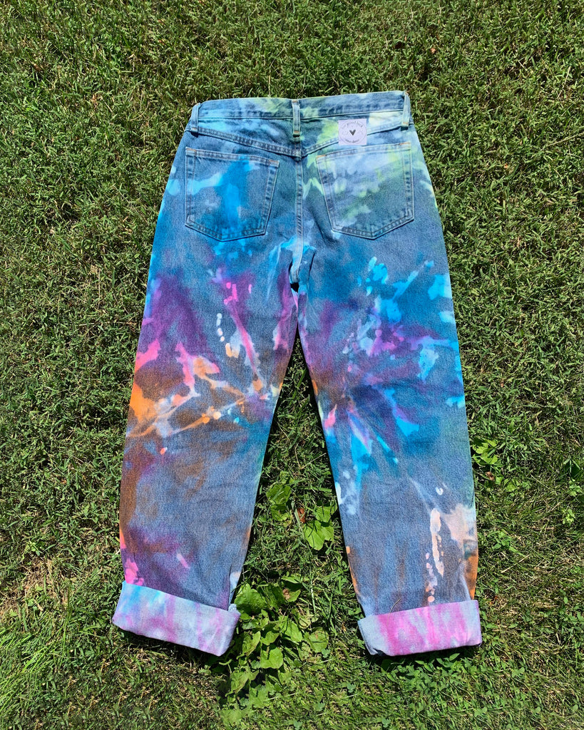 I've been working on perfecting repurposed denim with tie dye for months now and have finally created the Rainbow Magic Jeans. Our take on the classic rainbow hues swirled onto bleached high-waisted straight leg denim- a match made in heaven!