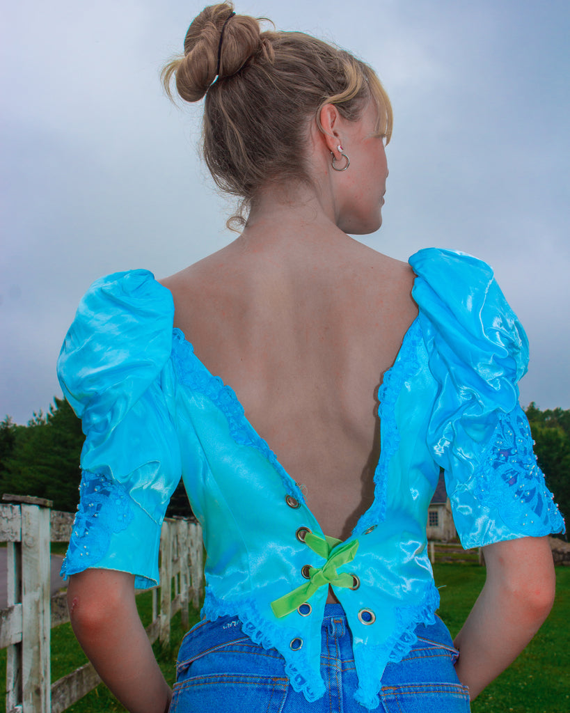 Originally a wedding gown from the 1980s transformed into a corseted top and dyed a bright baby blue.