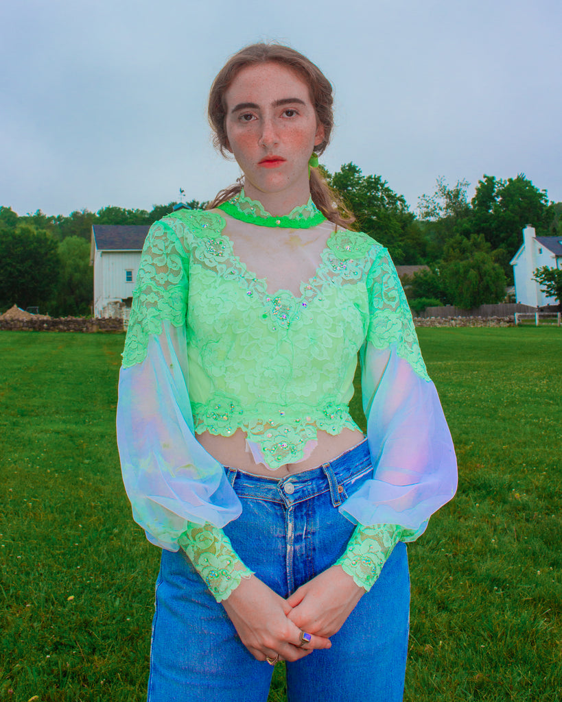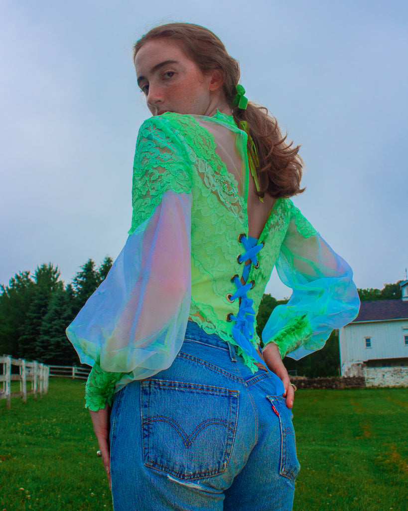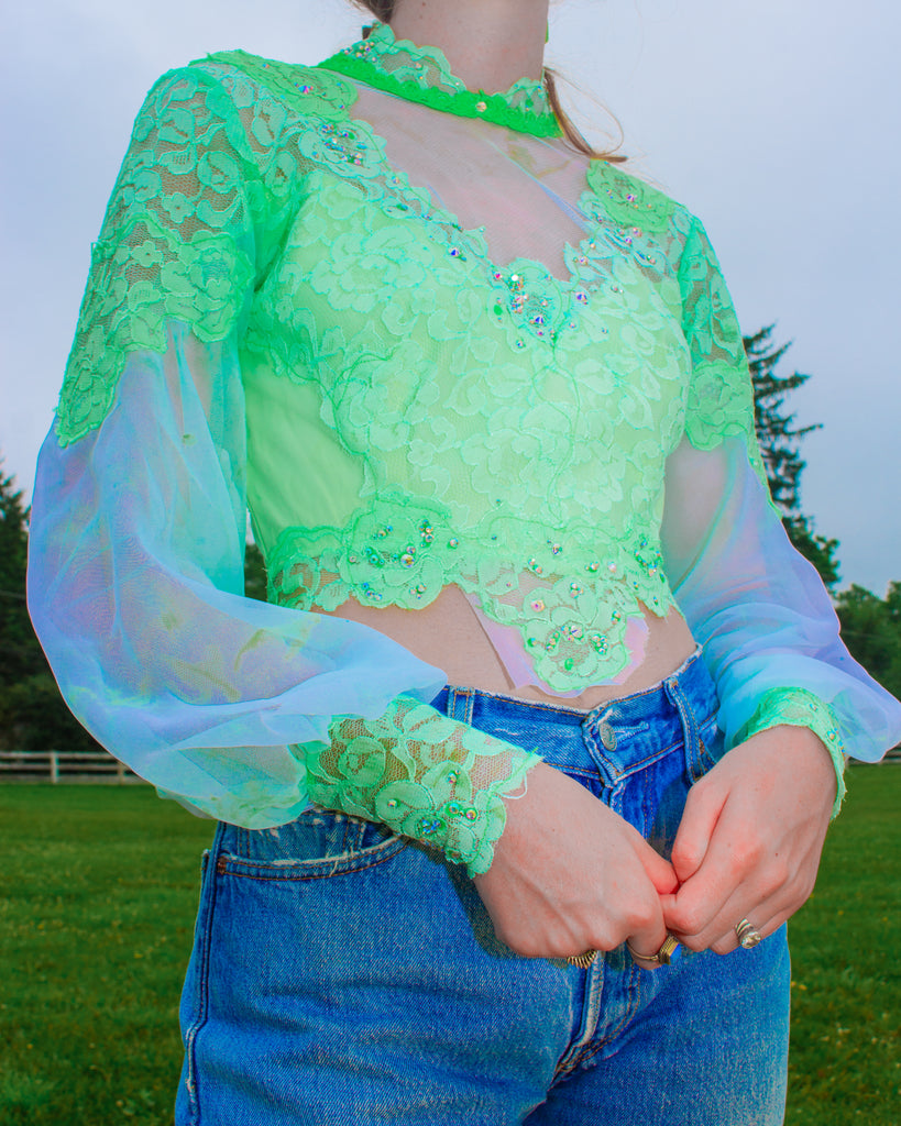 Princess Diana. My icon. She juxtaposed elegance and poise with her rebellious and fun style. Her fashion sense has definitely influenced The For Good Luck power combo- a wedding top paired with your fav jeans. This top brings together the sweetness of the 1960s lace and sleeves and a pop of neon green. To top it all off, the lace is studded with crystals to add a bit of sparkle.